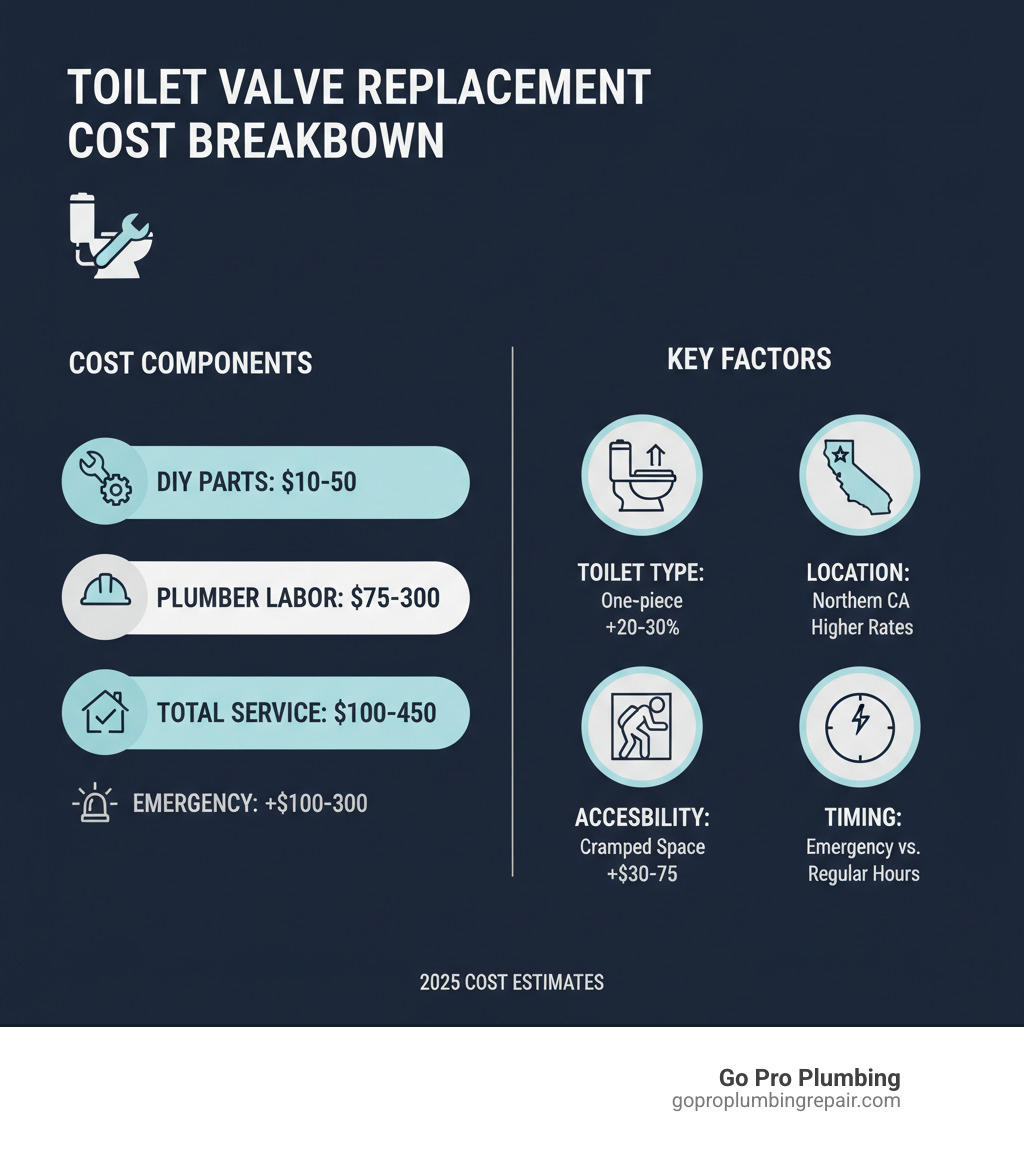 Not every toilet valve replacement costs the same. Several factors can push your final bill up or bring it down, and understanding them helps you anticipate what you’ll actually pay.